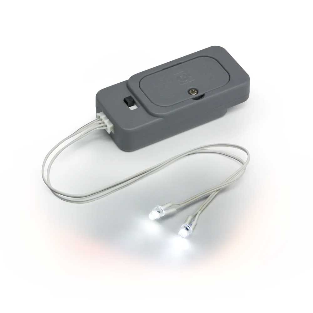 Set sadrži 2 bela LED svetla, koja se napajaju putem kutije za baterije sa prekidačem.