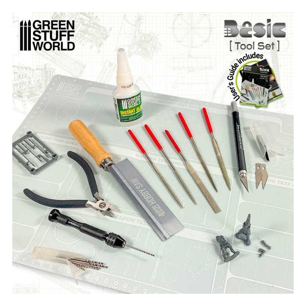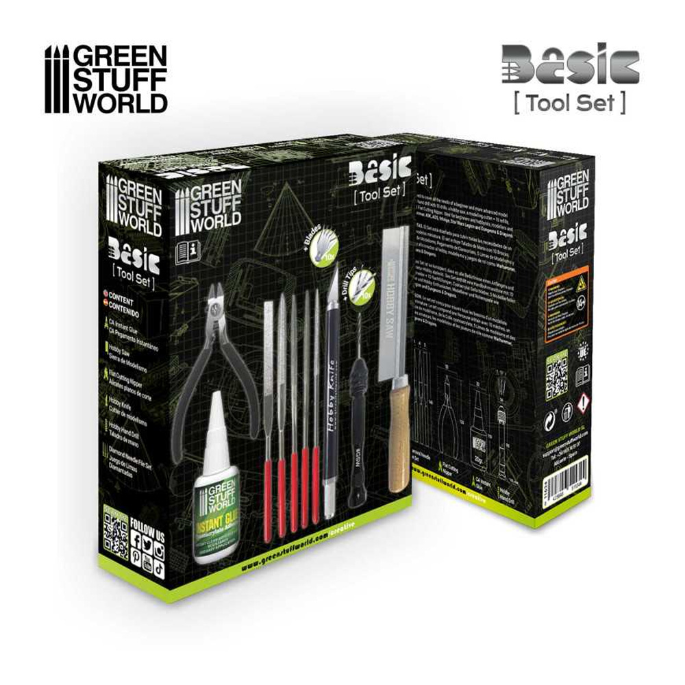 Komplet je dizajniran da pokrije sve potrebe početnika i naprednijih modelara u minijaturnom hobiju. Set uključuje ručnu bušilicu sa 10 bušilica, hobi testeru, modelirni rezač + 10 punjenja, cijanoakrilni instant lepak, 5 turpija za modeliranje i niper za ravno sečenje.