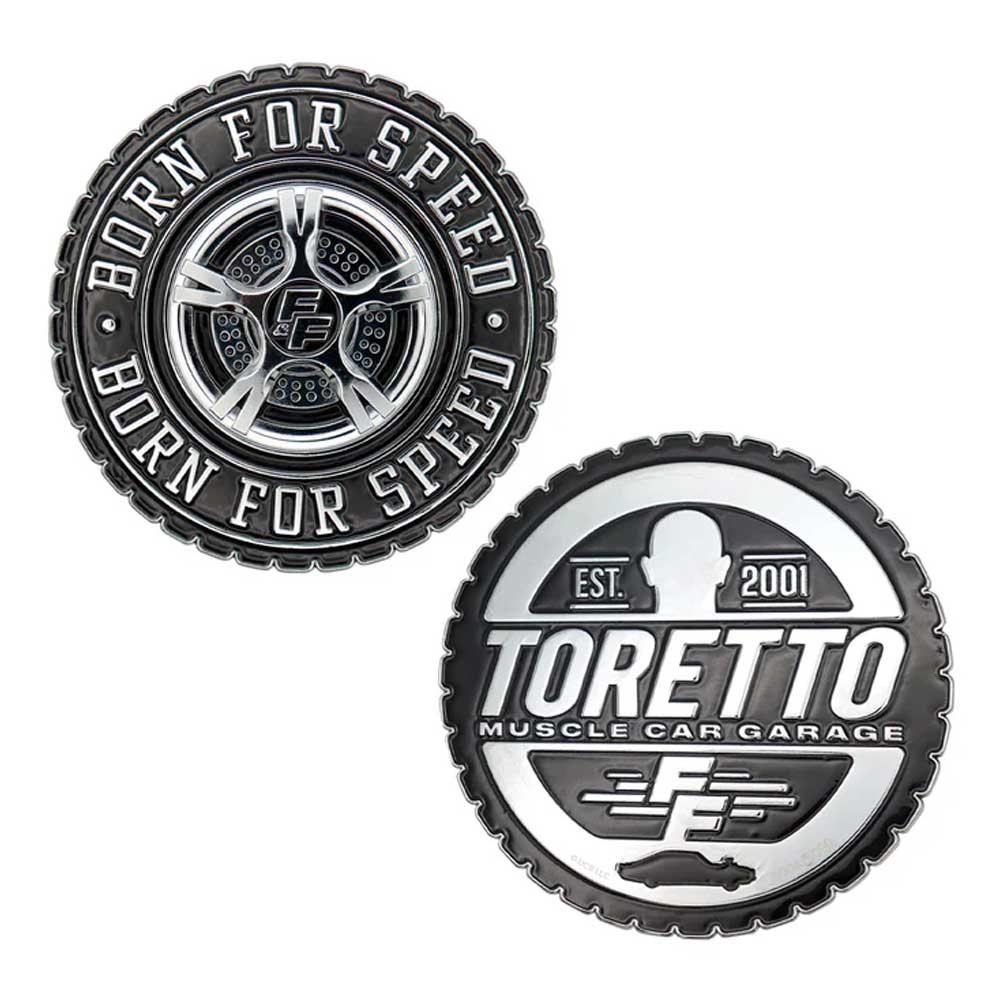 Pravljen za vožnju. Rođen za brzinu. Osetite Toretovu neumornu strast prema trkama i riziku uz ovaj limitirani metalni medaljon u obliku gume. Napravljen sa izraženim, detaljnim reljefom visokog oktanskog intenziteta, prikazuje Toretov logo Muscle Car Garage i slogan Born for Speed.