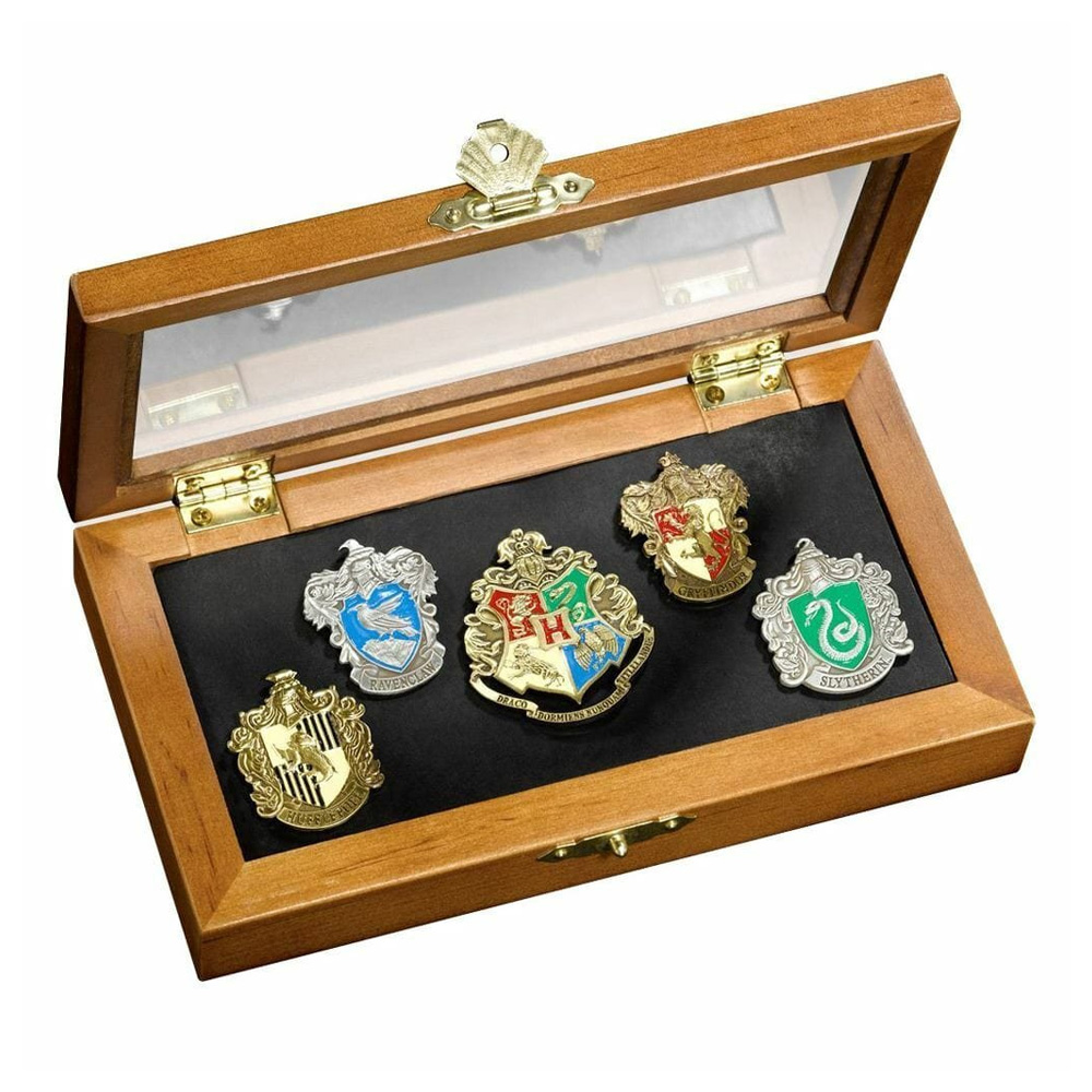 Drvena kutija sadrži set od pet bedževa sa motivima iz popularnog serijala Harry Potter.