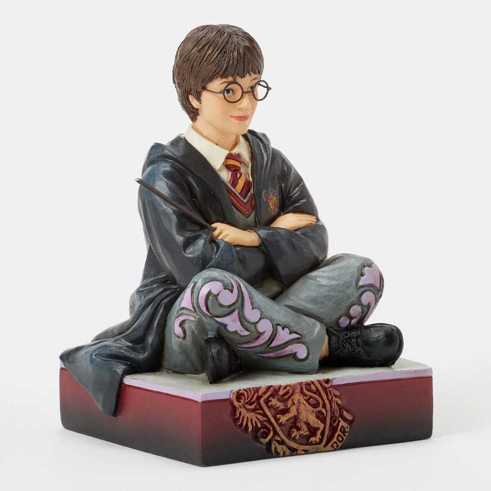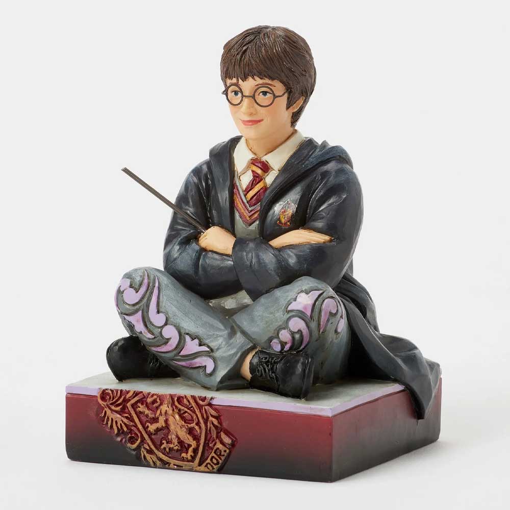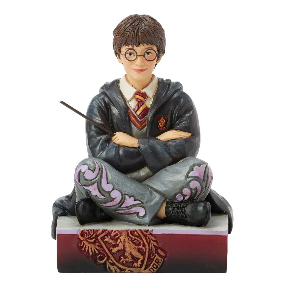 Upečatljiva figura iz kolekcije Jim Shore prikazuje Hari Potera kako sedi na podu u školskim odorama, sa štapićem spremnim u ruci. Njegov odlučan izraz lica oslikava njegovu herojsku prirodu, dok bogati detalji u narodnom umetničkom stilu oživljavaju njegov lik.