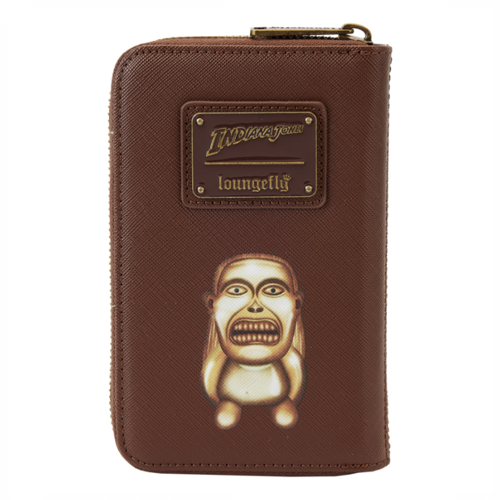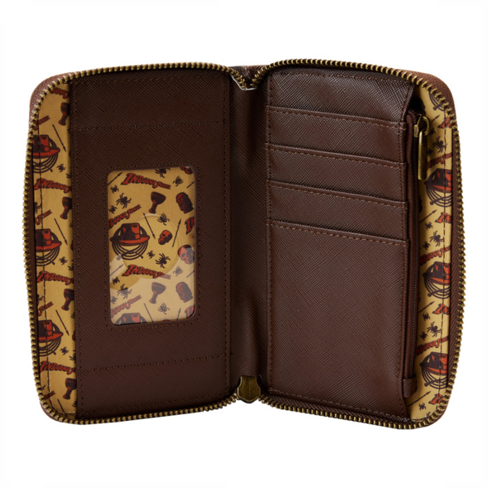 Indiana Jones Raiders novčanik je napravljen od veganske kože (poliuretan). Novčanik se zatvara patentnim zatvaračima i ima metalni hardver zlatne boje. Dodatne karakteristike uključuju utisnute i štampane detalje.
