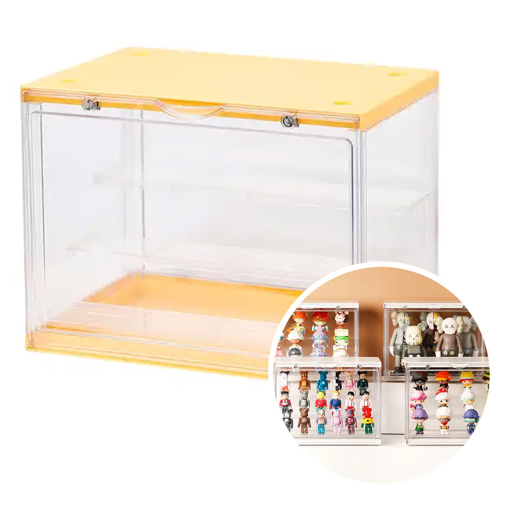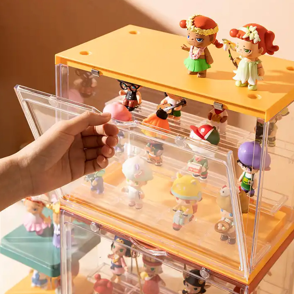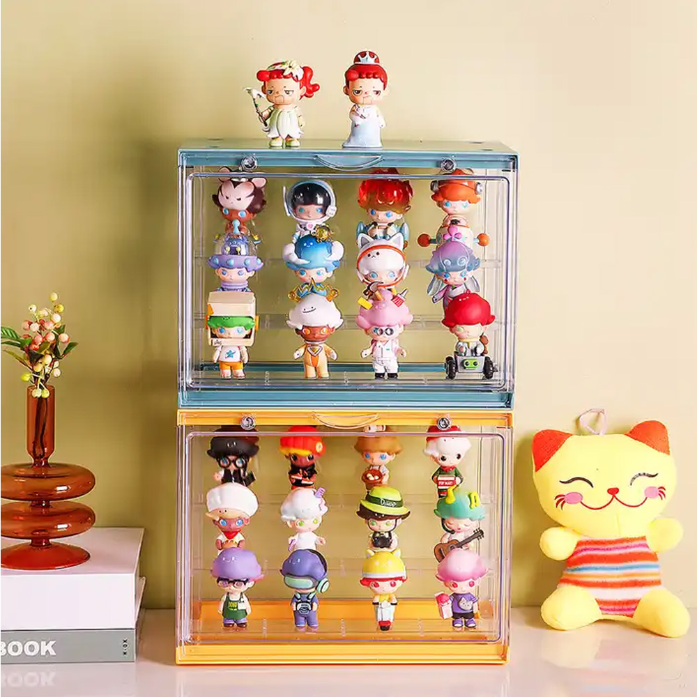 Kutija za izlaganje figurica sa tri police unutar kutije. Više ovakvih kutija se mogu slagati jedne na drugu.