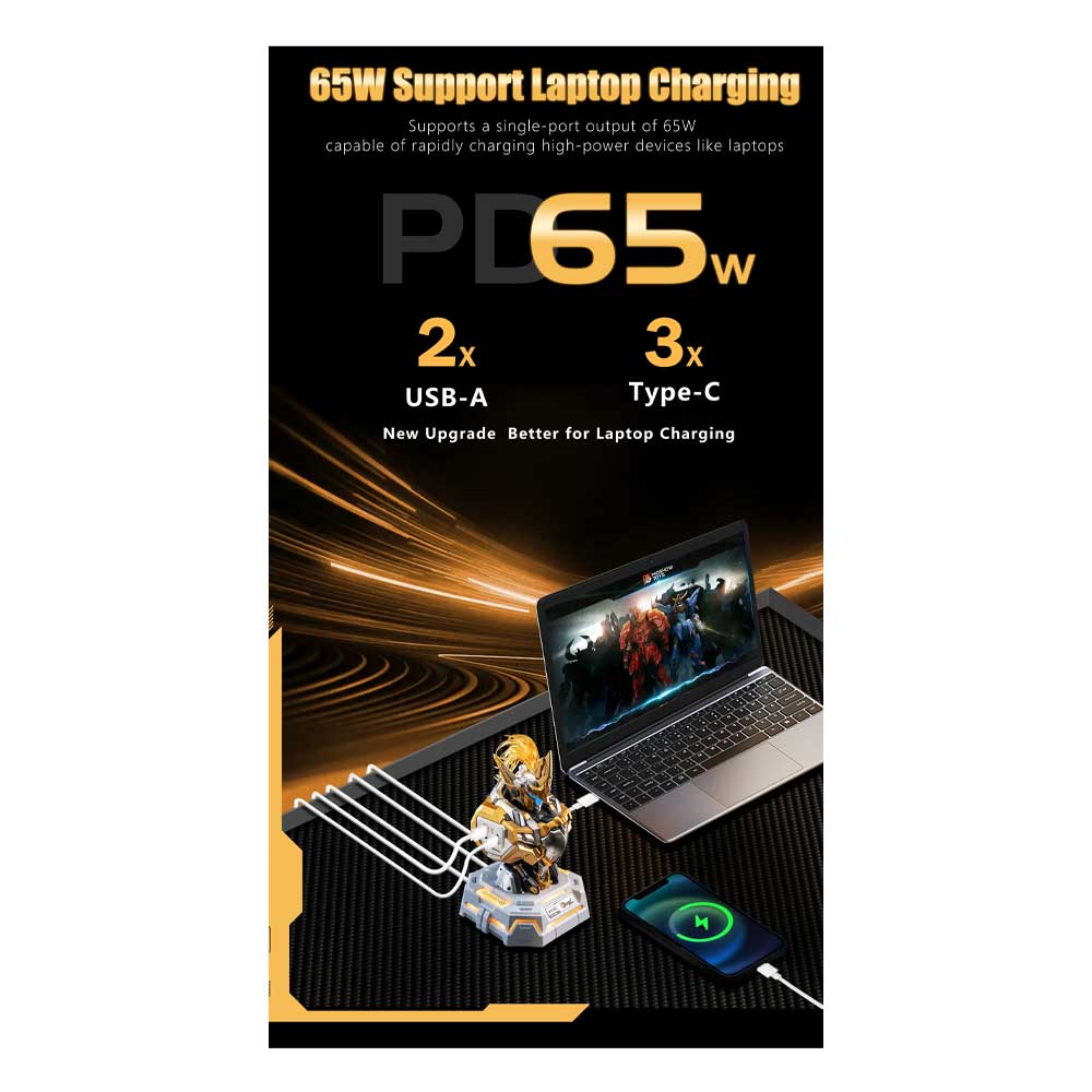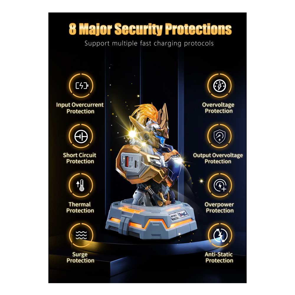 Sjajni zlatni Lancelot of the Lake nije samo kolekcionarska figura, već i praktičan USB punjač! Opremljen portovima na ramenima i grudima, omogućava istovremeno punjenje do 5 uređaja. Glava i postolje svetle kada je uključen, dodajući atraktivan izgled vašem radnom stolu. Savršen spoj funkcionalnosti i luksuznog dizajna!