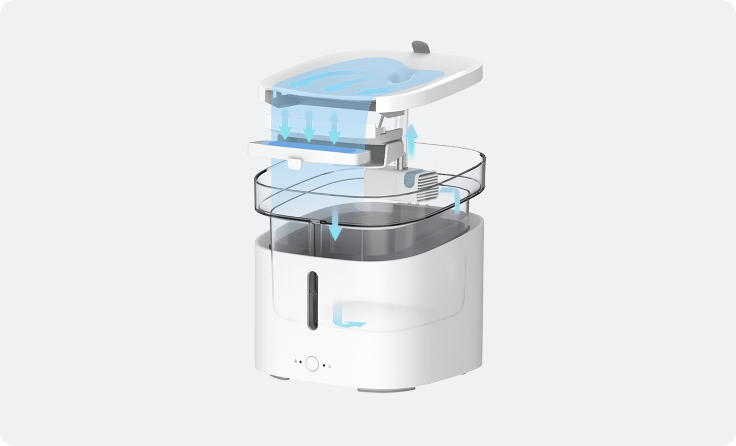 Xiaomi smart fontana za kućne ljubimce. Xiaomi Smart Pet fontana za kućne ljubimce simulira planinski potok, koristeći kružni vodeni krug kako bi ponudila tekuću vodu sa kiseonikom koja odgovara prirodi kućnih ljubimaca i povećava njihovo interesovanje za vodu za piće.Sa četvorostepenim efikasnim dubokim filtriranjem, fine čestice, dlake i zaostali hlor, uključujući jone Ca i Mg koji izazivaju kamen u bubregu, efikasno se presreću i filtriraju, obezbeđujući zdravu i ukusnu vodu koju ljubimci vole da piju.Visina fontane je više puta testirana kako bi se izbegao zvuk prskanja dok privlači kućnog ljubimca. Preusmjeravanje vode je dizajnirano za spor i tih protok, dok nadzemna pumpa može smanjiti rezonanciju. Radna buka se kontroliše unutar 30Db*. Trostepeno utišavanje donosi mirno okruženje.Fontana je testirana od strane autoritativne agencije za ispitivanje, dok rezervoar za vodu i poklopac su u skladu sa zahtevima za materijale u kontaktu sa hranom, obezbeđujući čistu, kvalitetnu i bezbednu vodu za kućne ljubimce.