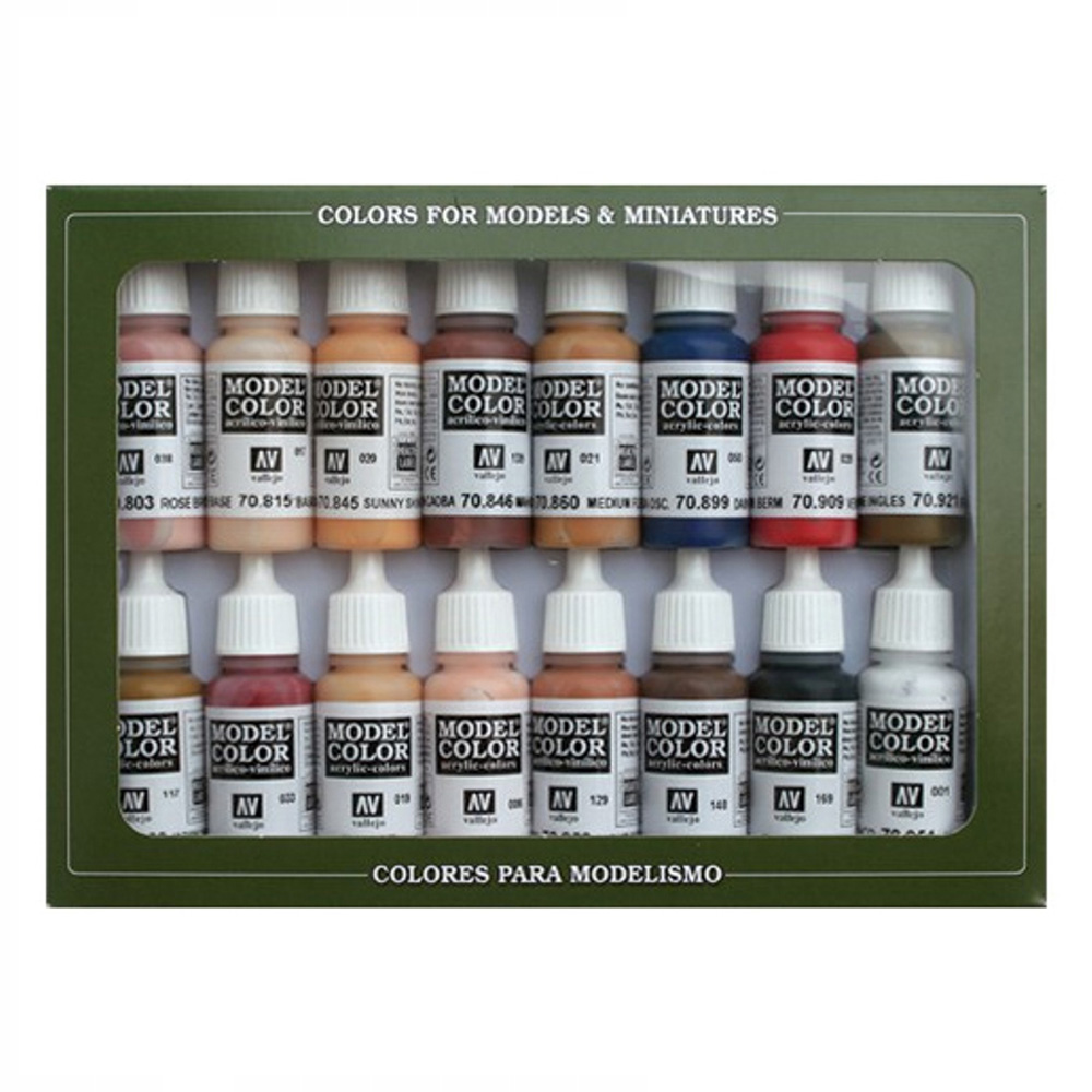 70.803 Rose Brown70.815 Basic Skin Tone70.845 Sunny Skintone70.846 Mahogany Brown70.860 Medium Fleshtone70.899 Dark Prus. Blue70.909 C. Red Vermillion70.921 English Uniform70.923 Japan Unif. WWII70.926 Red70.927 Dark Flesh70.928 Light Flesh70.929 Light Brown70.941 Burnt Umber70.950 Black70.951 White