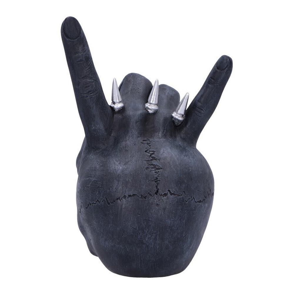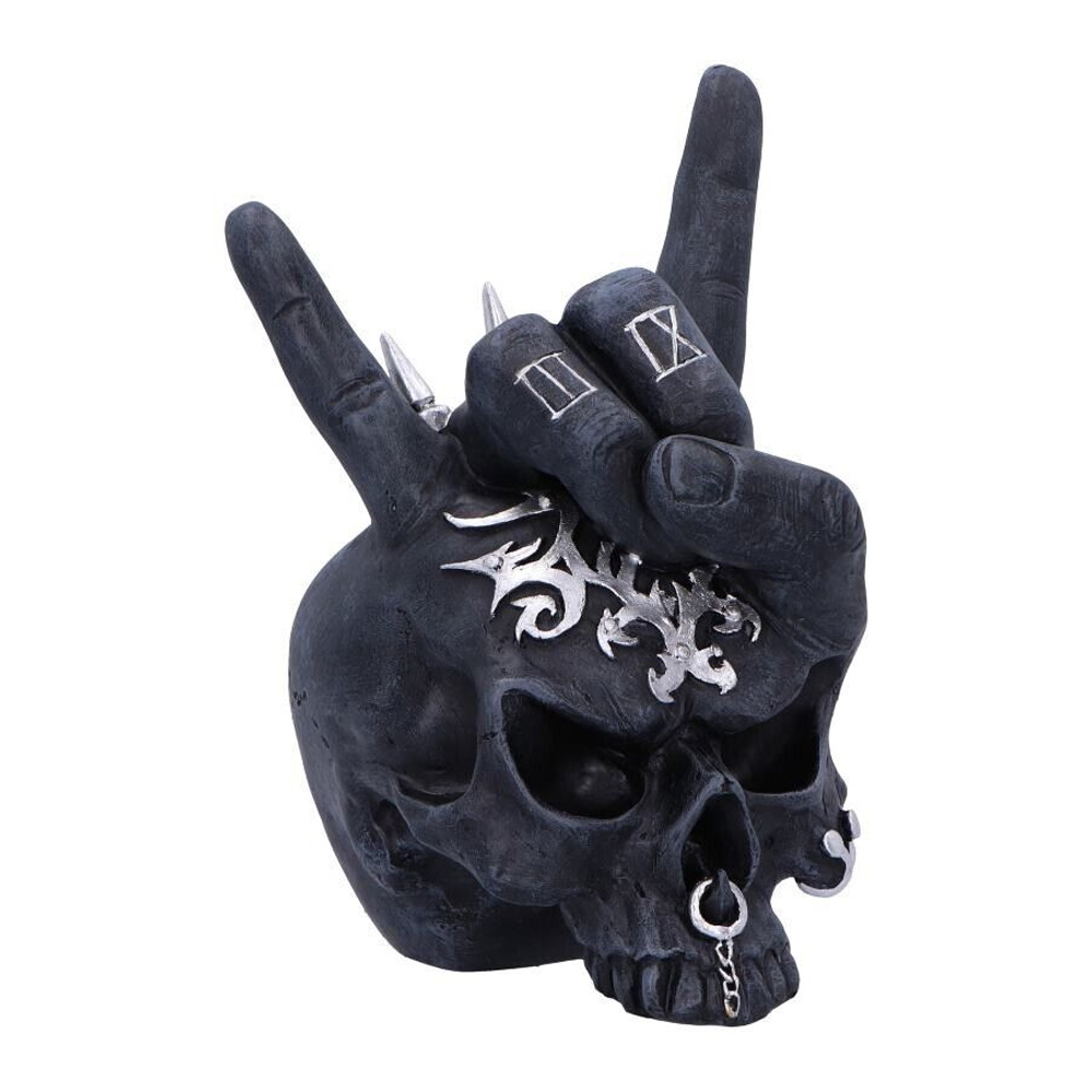 Horns Up lobanja je remek-delo od ručno oslikane smole sa tamnim, intenzivnim izrazom. Ukrašena srebrnim pirsinzima i složenim plemenskim tetovažama, odiše buntovnim stilom. Na vrhu lobanje nalazi se ponosna, istetovirana ruka sa srebrnim šiljcima, koja formira čuveni znak "đavoljih rogova" - ikonu rock i metal kulture. Svaki detalj je pažljivo izrađen kako bi odražavao strast i posvećenost ljubitelja rocka.