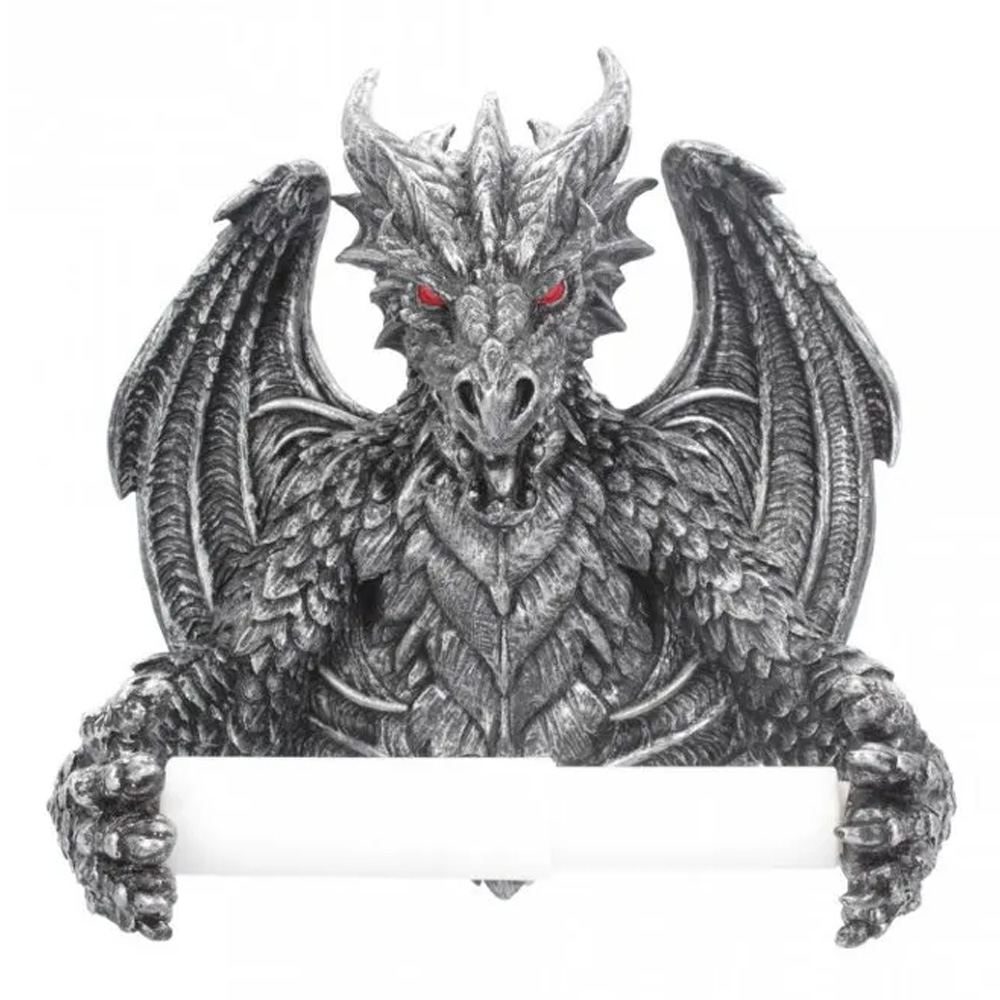 Gothic Dragon držač rolni toalet-papira. Proizvod ima 1 kuku za ključaonicu na poleđini za montažu na zid i takođe ima 2 rupe za šrafove, tako da se može bezbedno pričvrstiti za zid.