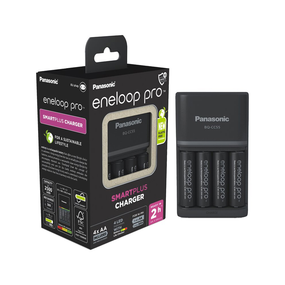 BQ-CC55 brzi punjač koji kontroliše mikroprocesor savršen je za zahtevne korisnike.Preko utikača formiranog u kućištu može se priključiti direktno na zidnu utičnicu.Poseban naglasak je praćenje pojedinačnih ležišta, pri čemu se svaki od eneloop-a puni pojedinačno, a proces punjenja se proverava i završava pojedinačno za svaku ćeliju preko minus-delta U.Status punjenja može se proveriti pojedinačno za svaku ćeliju zahvaljujući 4 LED diode.