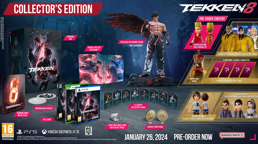 TEKKEN 8 nastavlja tragičnu sagu o Mišiminoj krvnoj liniji. Nakon što je pobedio svog oca, Heihachi Mishimu, Kazuia nastavlja svoje osvajanje za globalnu dominaciju, koristeći snage G korporacije za vođenje rata u svetu. Jin je primoran da se suoči sa svojom sudbinom dok se ponovo ujedinjuje sa svojom davno izgubljenom majkom i nastoji da zaustavi terorističku vladavinu svog oca Kazuje. Tekken 8 kolekcionarsko izdanje sadrži:- igru- specijalni Face-Off Steelbook- korporacione nalepnice- metalnu pločicu sa užarenim lancem- ekskluzivnu Jin figuru (figura ne svetli)- 8 sjajnih kolekcionarskih karata- Leroy Smith metalni prsten sa somotskom torbicom- Arkadni token (5 cm)- Paul Phoenix Avatar kostim- Kostim karaktera: Gold Suit Pack (32 kostima)- Avatar Skin KinJin- Igrivi karakter jednogodišnja propusnica (4 dodatna lika za igru)- Avatar kostim: klasični Tekken set majica (32 dizajna)- Avatar skinovi: Kazuya Mishima, Jin Kazama iJun Kazama