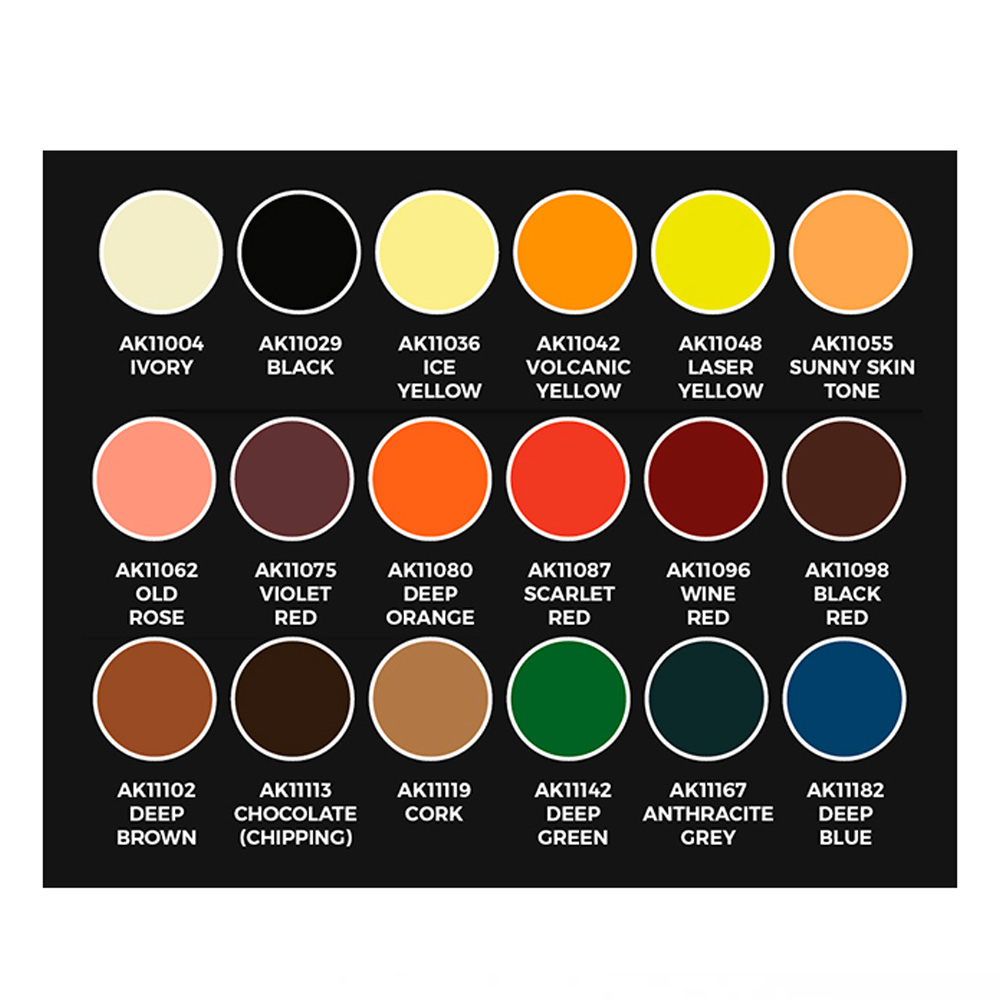 AK11004 IvoryAK11029 BlackAK11036 Ice YellowAK11042 Volcanic YellowAK11048 Laser YellowAK11055 Sunny Skin ToneAK11062 Old RoseAK11075 Violet RedAK11080 Deep OrangeAK11087 Scarlet RedAK11096 Wine RedAK11098 Black RedAK11102 Deep BrownAK11113 Chocolate (Chipping)AK11119 CorkAK11142 Deep GreenAK11167 Anthracite GreyAK11182 Deep Blue