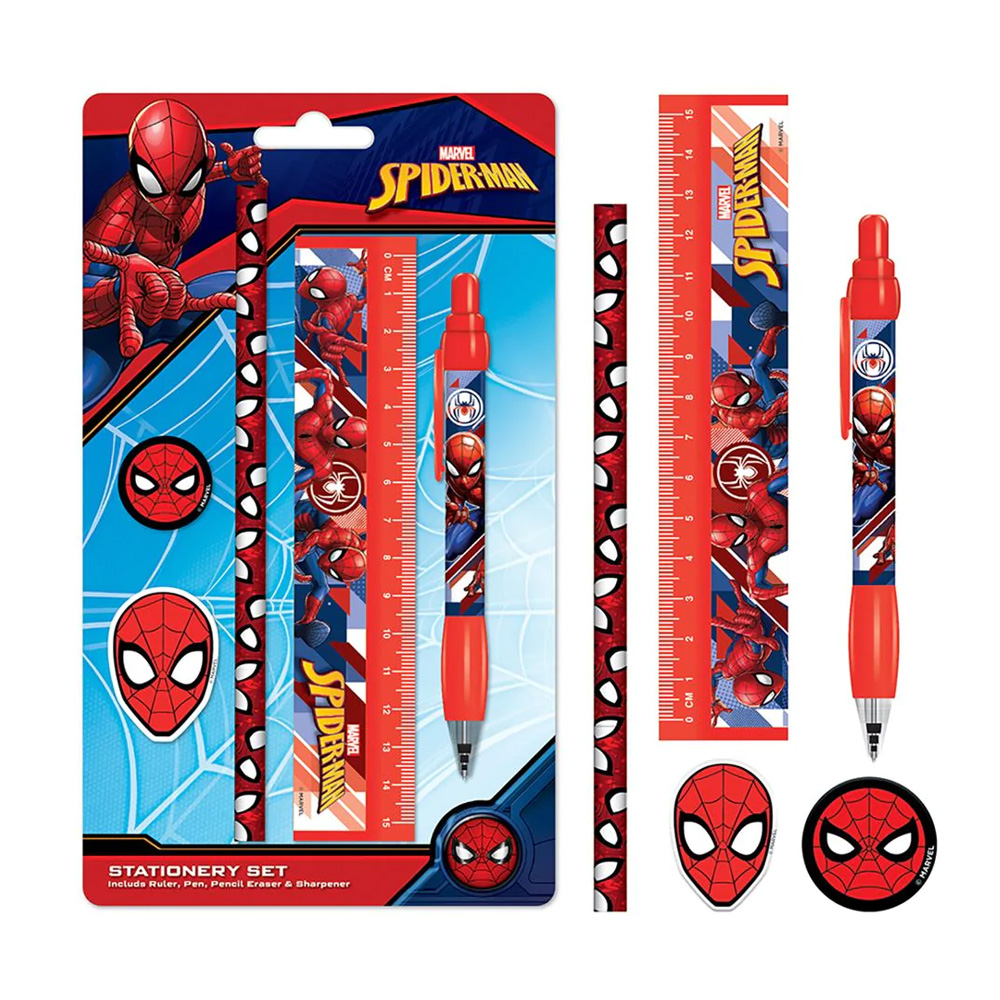 Spider-man školski set u kome se mogu naći 2 olovke, lenjir, oštrač za olovke i gumica.