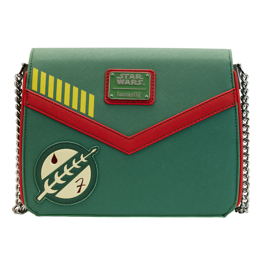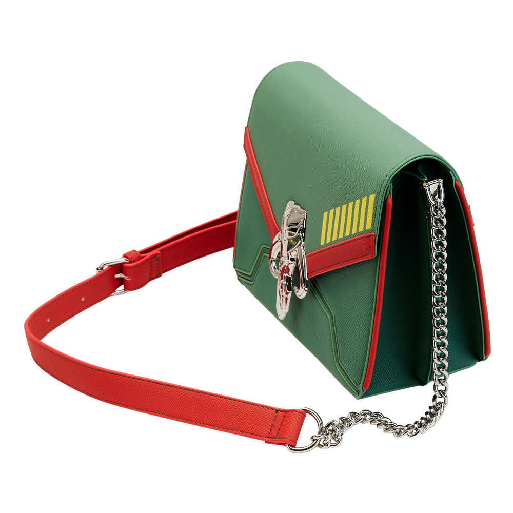 Loungefly Boba Fett Cosplay Crossbody torba je prikladna da se pridruži vašoj kolekciji Ratova zvezda. Podsećajući na kacigu Bobe Fetta, torbe ima crvene i žute oznake na prednjoj i zadnjoj strani. Izlivena metalna zakovica u obliku simbola Mandalorija drži torbu zatvorenom, a podesivi crveni kaiš za rame spaja izgled.