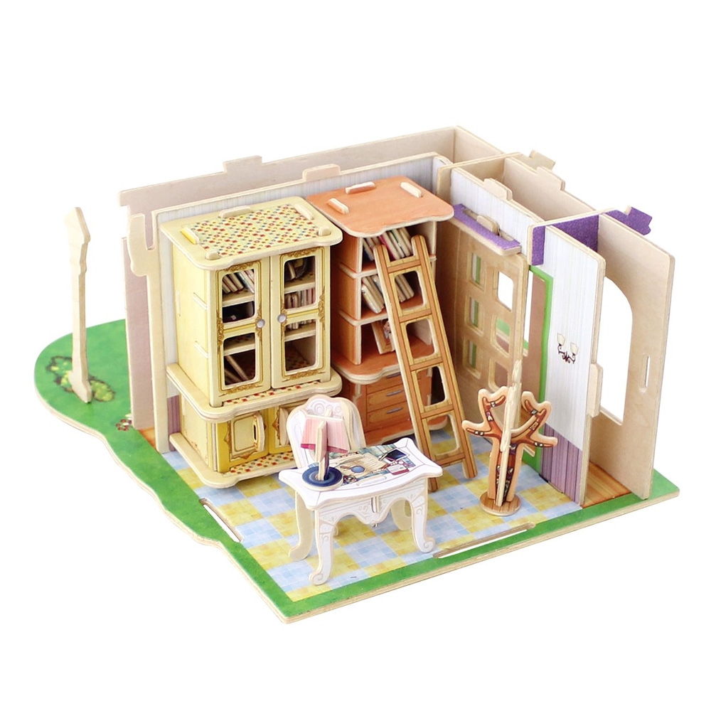 Komplet za izgradnju „Kuća sa studijom“ je 3D drvena slagalica pogodna za decu od 6 godina sa kojom možete sastaviti malu minijaturnu kućicu za lutke.