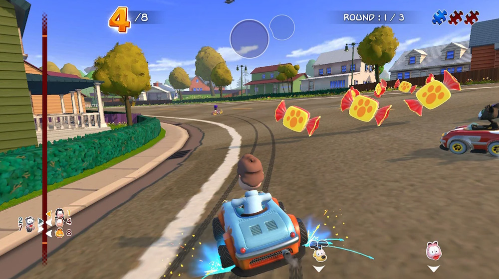 Garfild, mačak poznatiji kao veliki ljubitelj lazanja se vraća Jonu, Odie i ostalima u novim uzbudljivim trkama. Svaki lik ima svoje posebne karakteristike koje će ti pomoći da pobediš. Budi prvi na startu i prvi stigni do nekih od mnogo neverovatnih bonusa koji će ti pomoći da nadmudriš protivnike i olakšaš sebi pobedu. Budi pametan kao Garfield i koristi prečice na mapi i stigni do cilja pre ostalih. Trkaj se sam ili online protiv drugih ljudi na 16 neverovatnih staza iz Garfildovog sveta u 3 moda: Grand Prix, Single Race i Time Trial. Igraj online i oprobaj se protiv drugih u trci do čak 8 igrača. Sakupi novac, unapredi i ulepšaj svoje vozilo sa bezbroj dodataka.