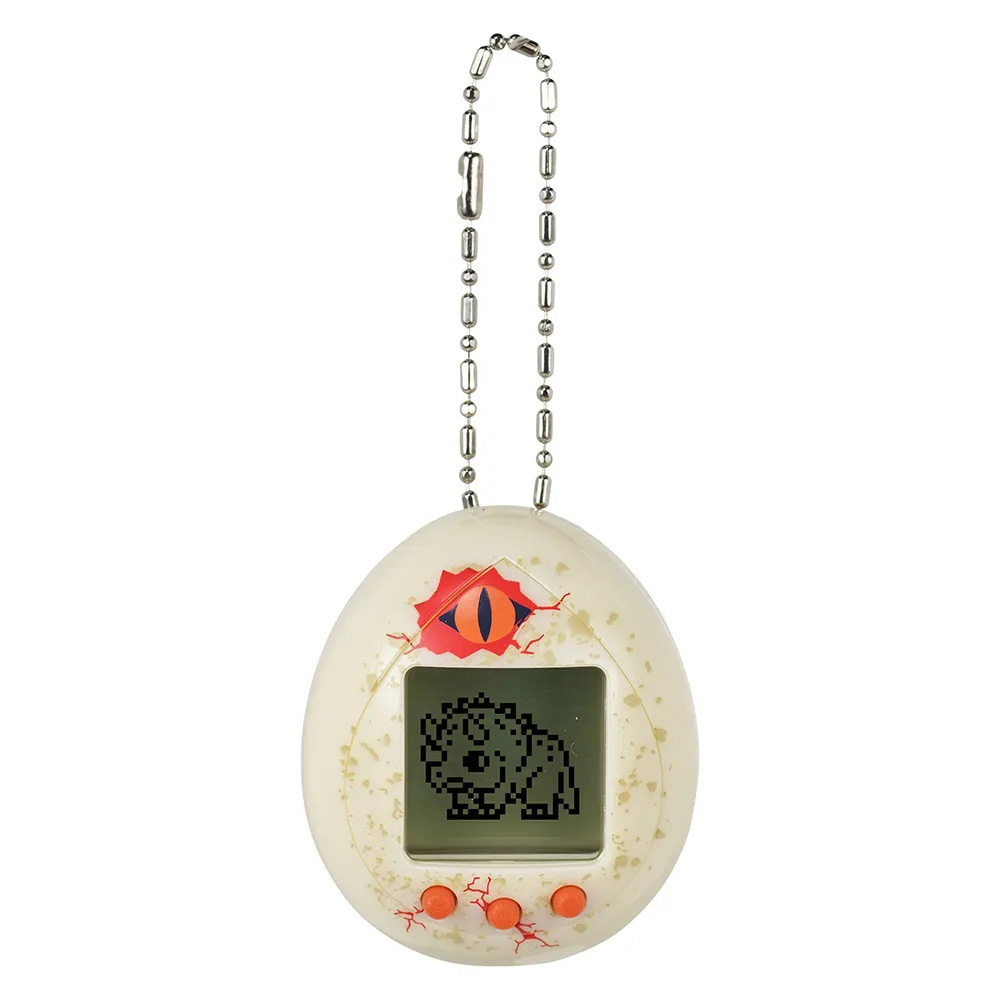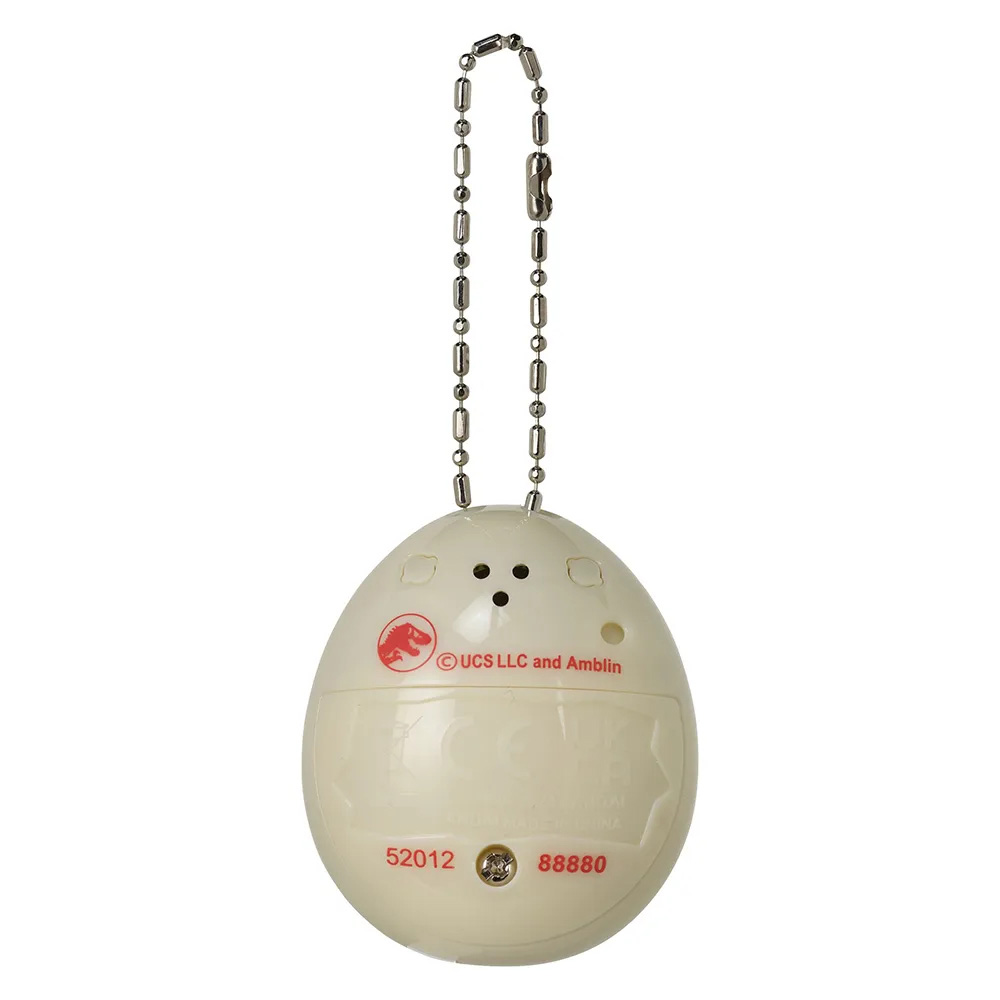 U ovoj saradnji 30. godišnjice Jurassic Park-a i Tamagotchija, imate priliku da odgajate svoje dinosauruse! Ako su gladni, možete ih hraniti lišćem i orašastim plodovima ako su biljojedi, ili mesom i ribom ako su mesožderi. Kada su lošeg raspoloženja, ponudite im grickalicu ili se igrajte tri mini-igre. Mini-igre koje možete igrati nazivaju se "Koja je?”, “Beg” i “Uhvati hranu!”. Zavisno o tome kako se brinete o svojoj bebi dinosaurusu, može se razviti u preko 20 različitih vrsta dinosaurusa. Osim likova koje negujete, mogu se pojaviti i retki dinosaurusi! Ako se ne pravilno brinete o svom dinosaurusu, mogli bi vas napustiti. Baterije (LR44x2) su uključene. Za uzrast od 8 godina i više.