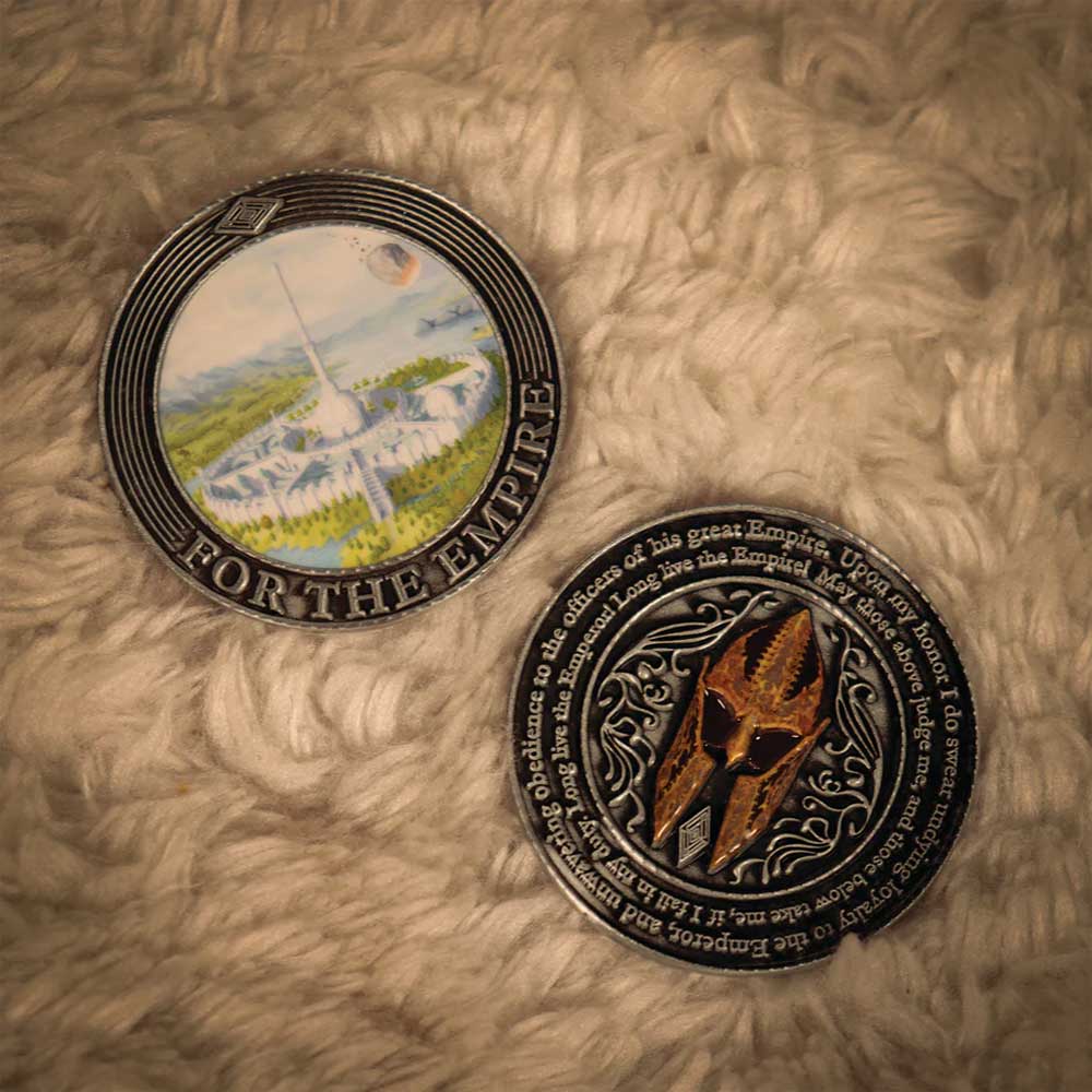 Zavetovan lojalnošću carstvu Septima, novčić Imperial City prikazuje Carsku palatu s jedne strane, dok se na poleđini nalazi carska kaciga.
