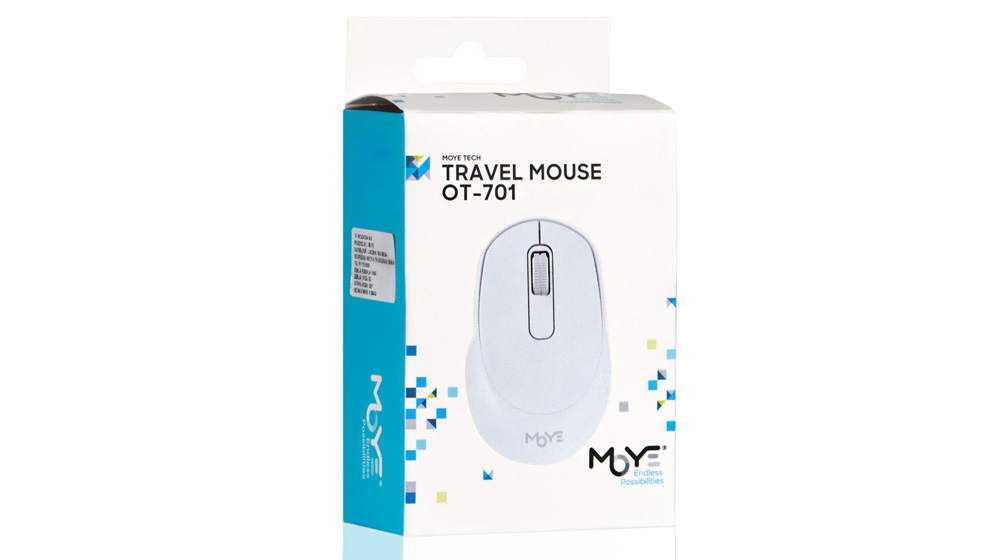 MOYE Travel je 2.4G bežični miš sa dometom od 20 m. Poseduje optički senzor i rezoluciju od 1600DPI. Životni vek prekidača iznosi 3 miliona klikova. Miš ima taster za uključivanje/isključivanje napajanja.