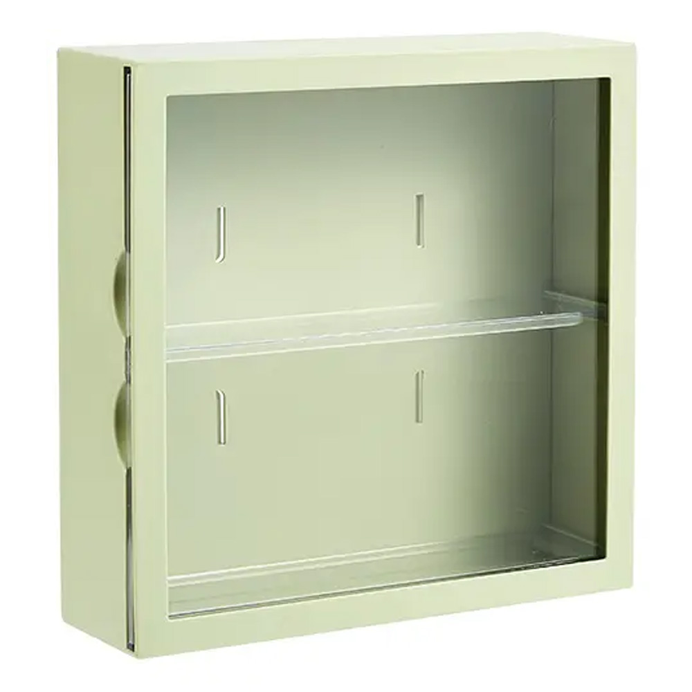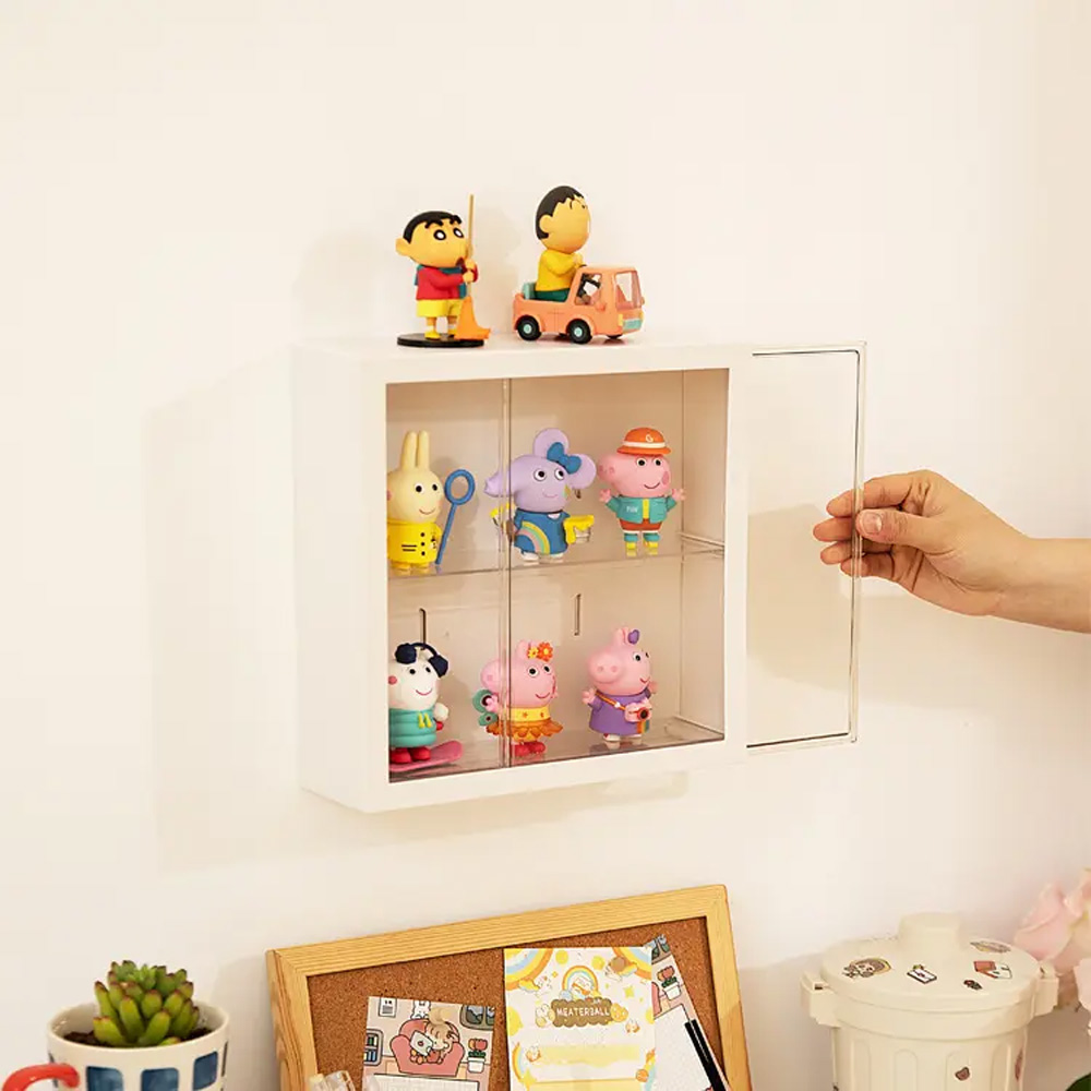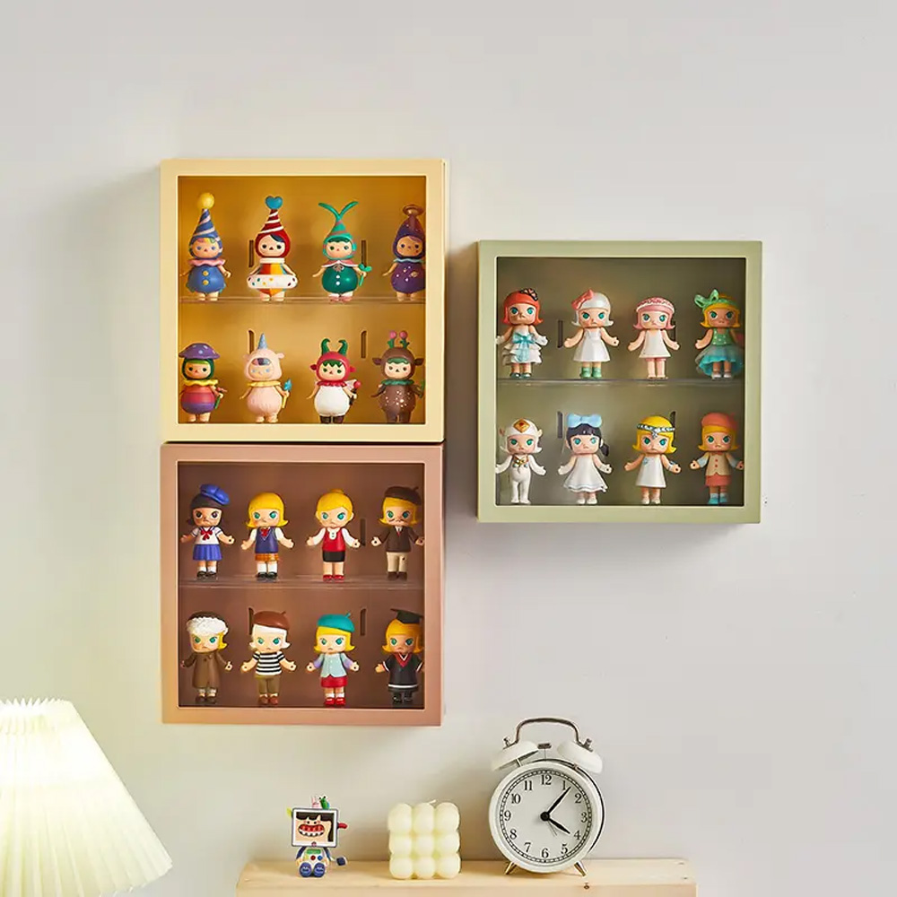 Kutija sa vratima za izlaganje figurica. Dimenzije kutije su 24.5 x 24.5 x 8 cm.