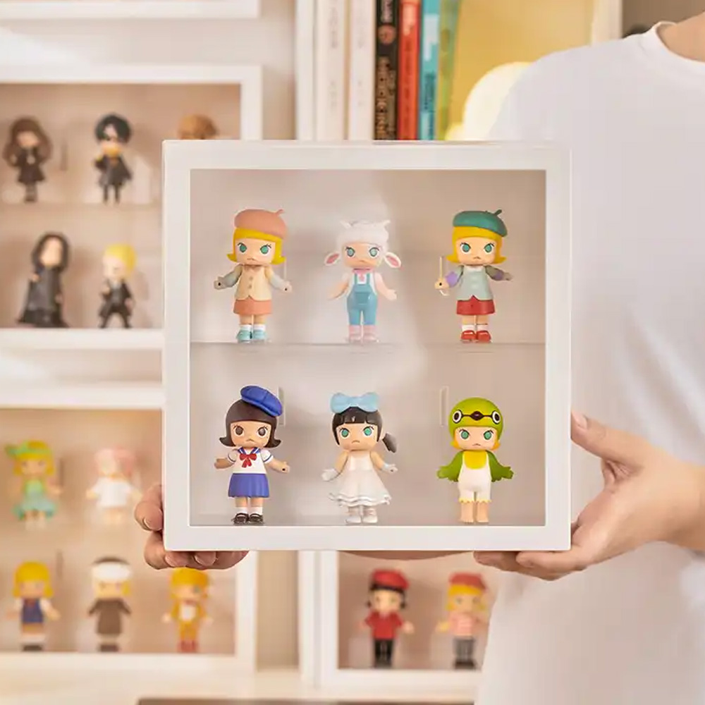 Kutija sa vratima za izlaganje figurica. Dimenzije kutije su 24.5 x 24.5 x 8 cm.