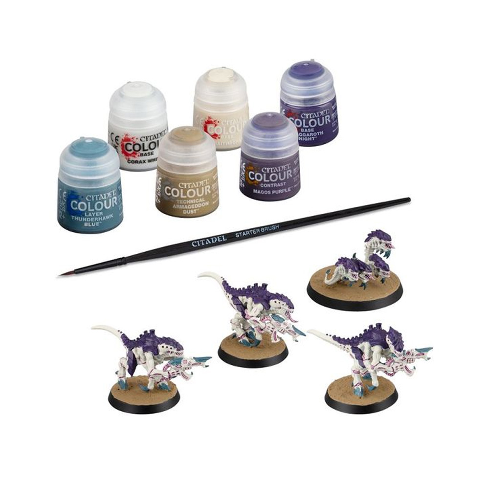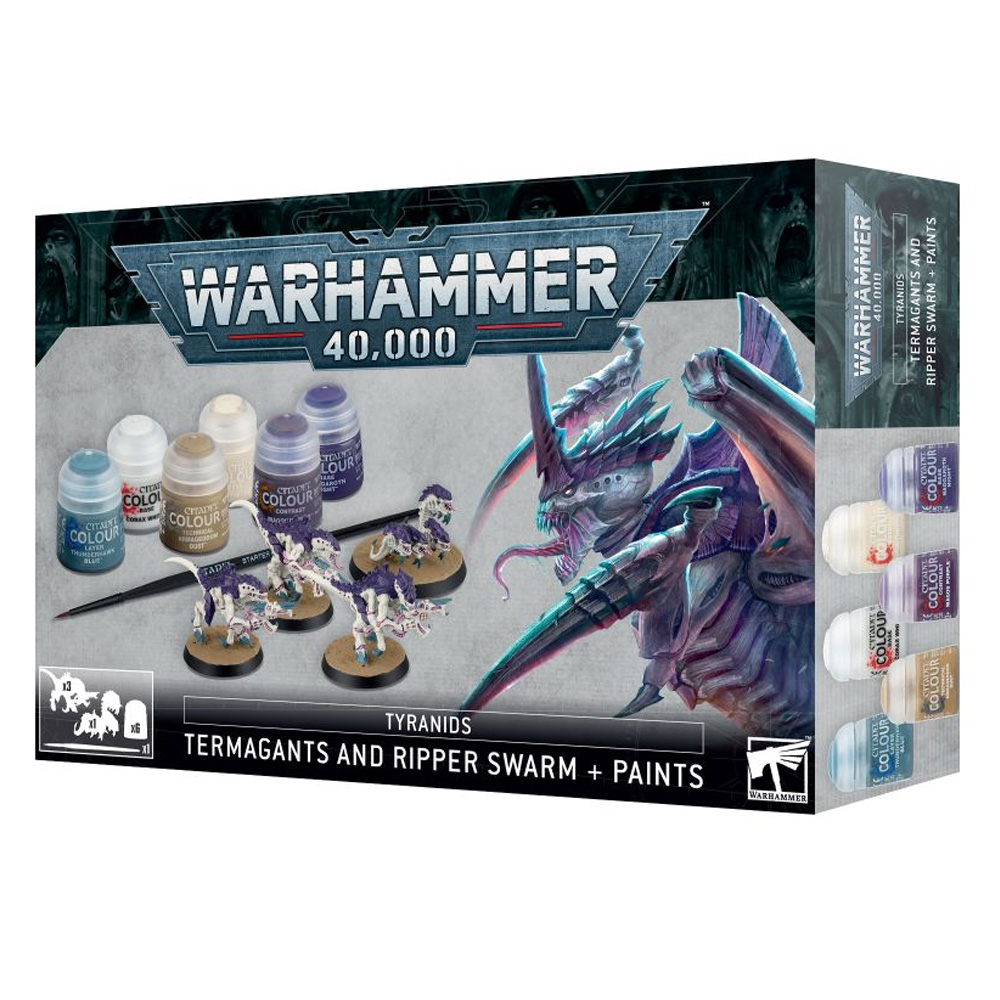 U setu ćete dobiti tri plastična Termaganta, svaki sa različitom pozom, plus plastični Ripper Swarm, kao i sve boje koje su vam potrebne da ih pripremite za bitku. U pakovanju dolazi i četkica.Šest boja Citadel Color se isporučuju u bocama od 12 ml i sadrže osnovne boje potrebne za farbanje minijatura Hive Fleet Leviathan. - Corax White (Base)- Wraithbone (Base)- Naggaroth Night (Base)- Thunderhawk Blue (Layer)- Magos Purple (Contrast)- Armageddon Dust (Technical)