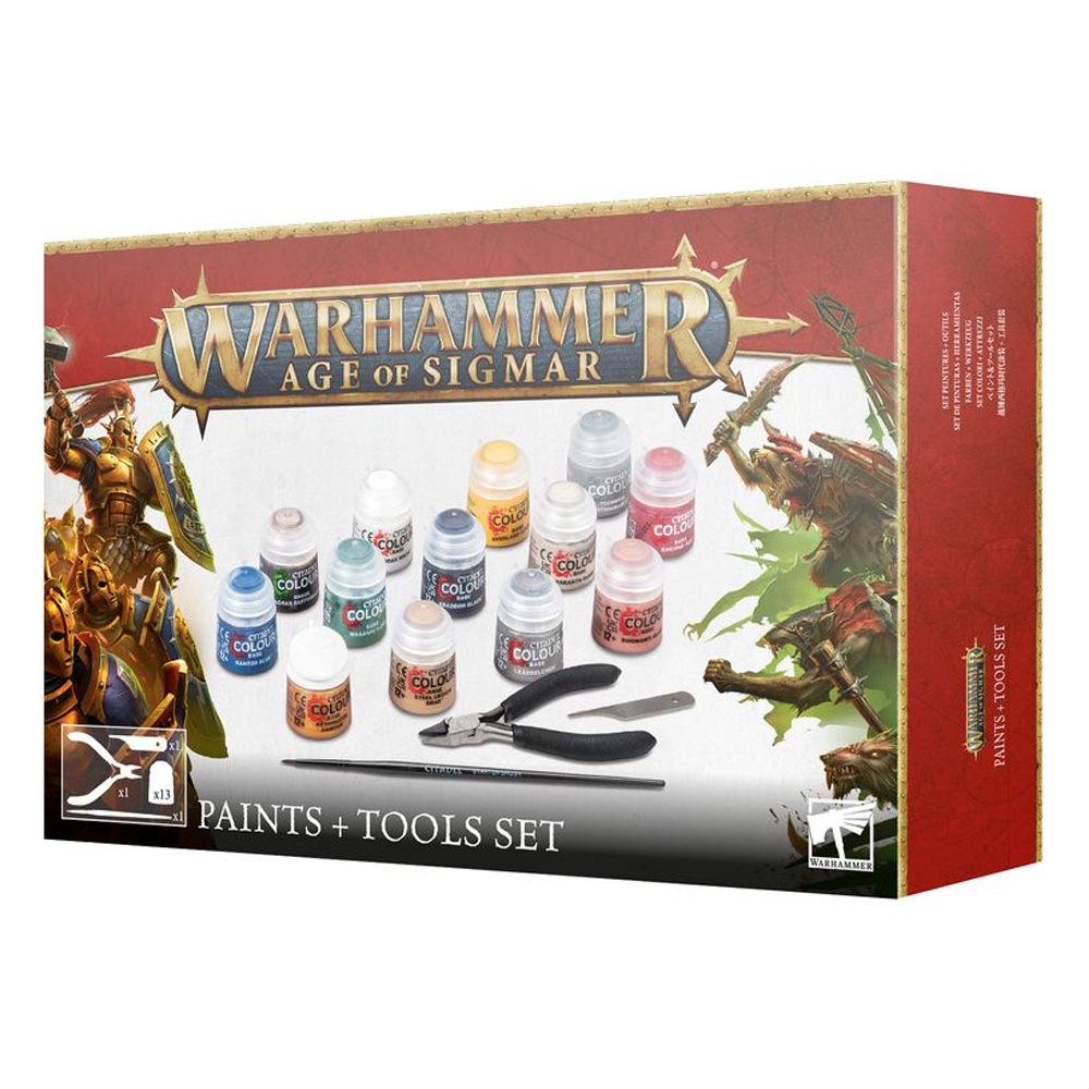 Warhammer je minijaturni wargame dizajniran za upotrebu vlastitih modela koje sami sklapate i bojite po ličnoj želji.Set sadrži:- 13 boja:1x Corax White1x Abaddon Black1x Averland Sunset1x Leadbelcher1x Kantor Blue1x Mephiston Red1x Rhinox Hide1x Retributor Armour1x Orruk Flesh1x Bugman's Glow1x Steel Legion Drab1x Stirland Mud1x Agrax Earthshade- Citadel Starter četkicu- Citadel Starter makazice- Strugač plastikeWarhammer je smešten u izmišljenom univerzumu koji je poznat po svom "mračnom i mršavom" pozadinskom svetu, koji sadrži uticaje iz priča kao i mnoge istorijske uticaje. Geografija sveta Warhammera vrlo podseća na Zemlju zbog manipulacije drevnom rasom u svemiru poznatom kao Stari. Ova misteriozna i moćna rasa posetila je Warhammer World u dalekoj prošlosti. Uspostavljajući osnovu, krenuli su u manipulaciju geografijom i biosferom planete. Uz pomoć Slannovih sluga, pomerili su orbitu planete bliže suncu i uredili kontinente po svojoj želji. Da bi putovali između svetova, Stari su koristili portale do druge dimenzije ("warp kapije"), koje su gradili na severnom i južnom polu Warhammer sveta. Na kraju su se, međutim, ove kapije srušile, omogućujući sirovoj magičnoj energiji i demonskim silama Haosa da se izliju u svet Warhammera.