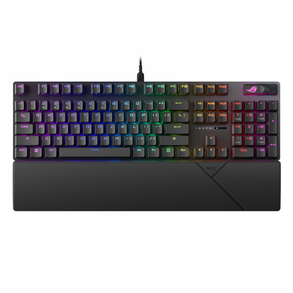 ROG Strix Scope II tastatura za igre sa unapred podmazanim ROG NX Snow i NX Storm mehaničkim prekidačima, penom za prigušivanje zvuka, PBT duplim poklopcima tastera ili ABS tasterima obloženim UV, prečicama za striming, multifunkcionalnim kontrolama, tri ugla nagiba i naslonom za zglob.