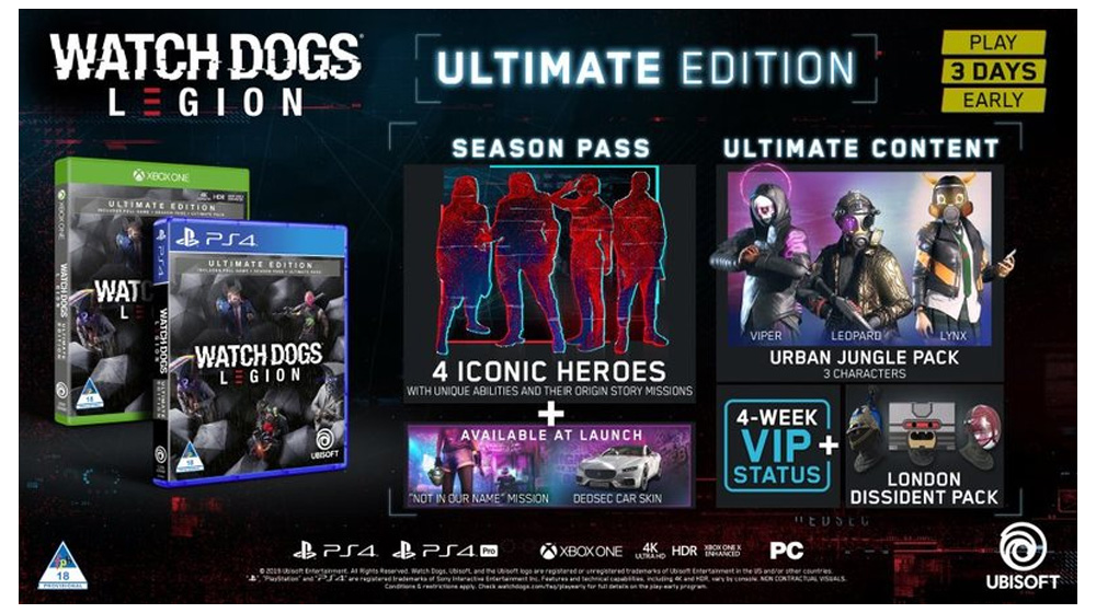 Ultimate Edition sadrži:- igru- 3 dana raniji pristup- Season Pass- DLC misiju „Not In Our Name“- DLC Urban Jungle Pack (tri nova karaktera – Lynx, Leopard i Viper)- DLC 4-nedeljni VIP status- DLC The London Dissident Pack (tri nove maske – The Sapphire Guard, The Cardboard Cyborg, The Distortion)- DLC Watch Dogs Complete EditionLondon se suočava sa totalnim kolapsom. Diktatorski big brother režim ugnjetava ljude, privatne vojske kontrolišu ulice, a snažni kriminalni kartel drži sve u svojim rukama. Sudbina grada leži u vašim rukama i vašim sposobnostima da uzvratite udarac. Dobrodošli u Resistance! Očekuje vas open-world velika mapa Londona u kojoj možete posetiti sve znamenitosti. Najveća inovacija u gamingu do sada donosi mogućnost da igrate sa svakim karakterom u igri koji se pridruži vašem pokretu. Hakovanje je vaše najjače oružije – borbeni dronovi, stelth spider-bots, Augmented Reality Cloack i još mnogo toga.